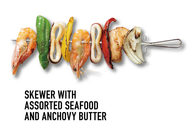 エビ・イカ・ホタテに旬野菜を組み合わせました。アンチョビバターがきめてです。